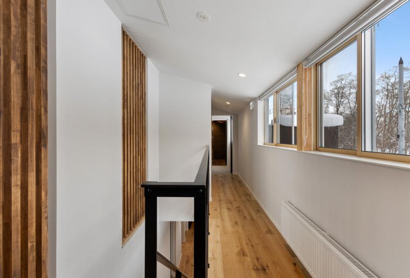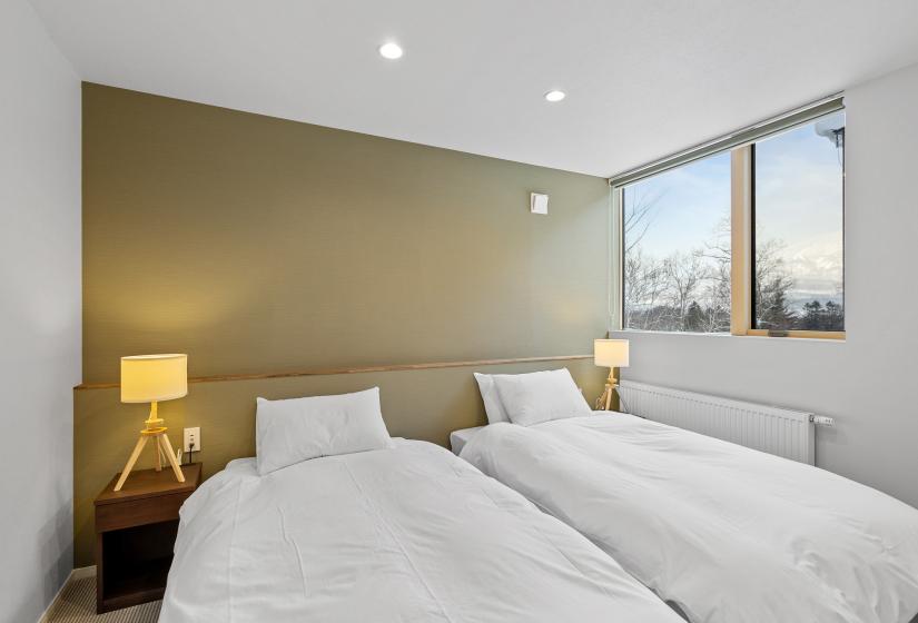 The thoughtfully designed interior spans two levels, featuring four beautifully appointed bedrooms, each with private facilities. The upper floor hosts the master and second bedroom with private showers, while the lower floor bedrooms share access to a generously sized Hinoki-style bath – perfect for soothing tired muscles after a day on Niseko's legendary powder.
