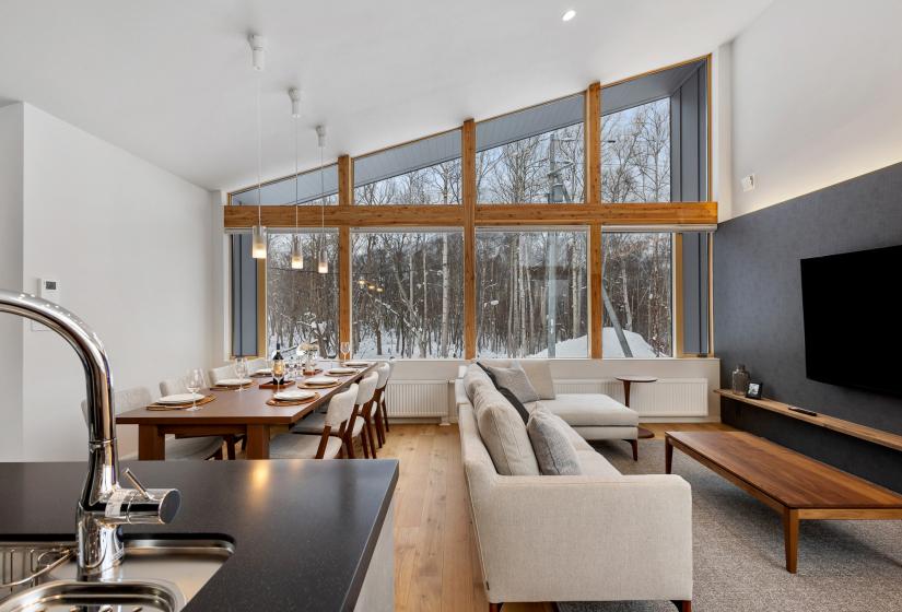 The heart of the home is a spectacular open-plan living space, where floor-to-ceiling windows frame mesmerizing snow views. Here, you'll find a chef-worthy kitchen, elegant dining area seating eight, and a sumptuous lounge area complete with a large-screen TV for perfect après-ski relaxation.